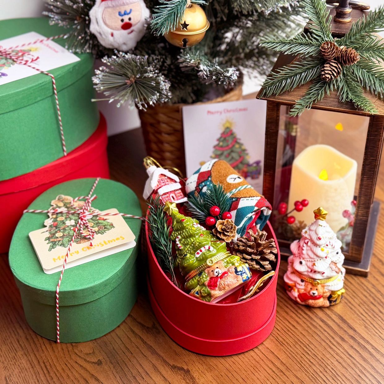 A festive Christmas gift set featuring a ceramic Christmas jar, holiday candle, cozy socks, and ornaments — beautifully packed and ready to gift.