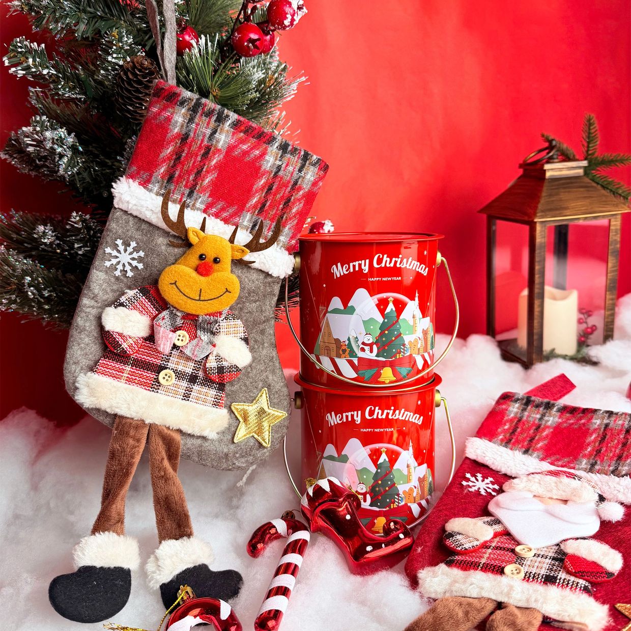 A festive metal tin filled with a hanging Christmas stocking and cute tree decorations, perfect for gifting or adding holiday charm at home.